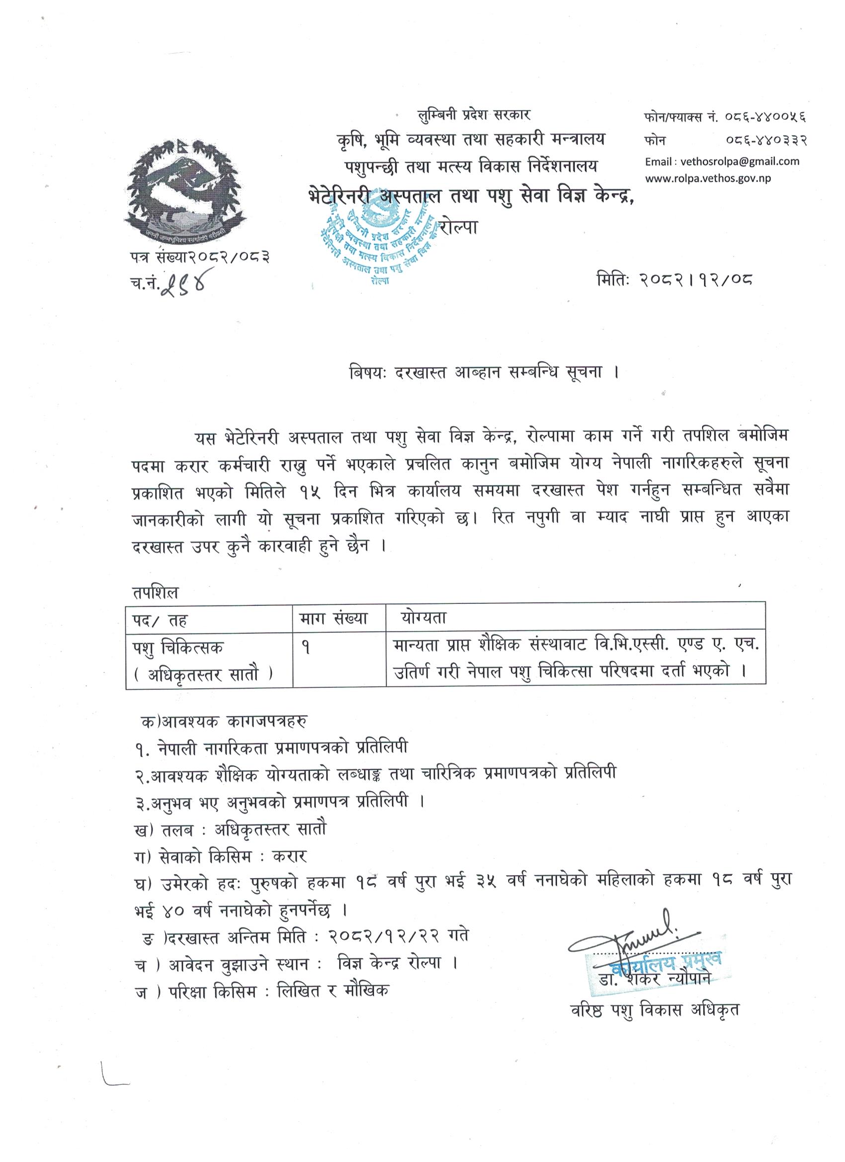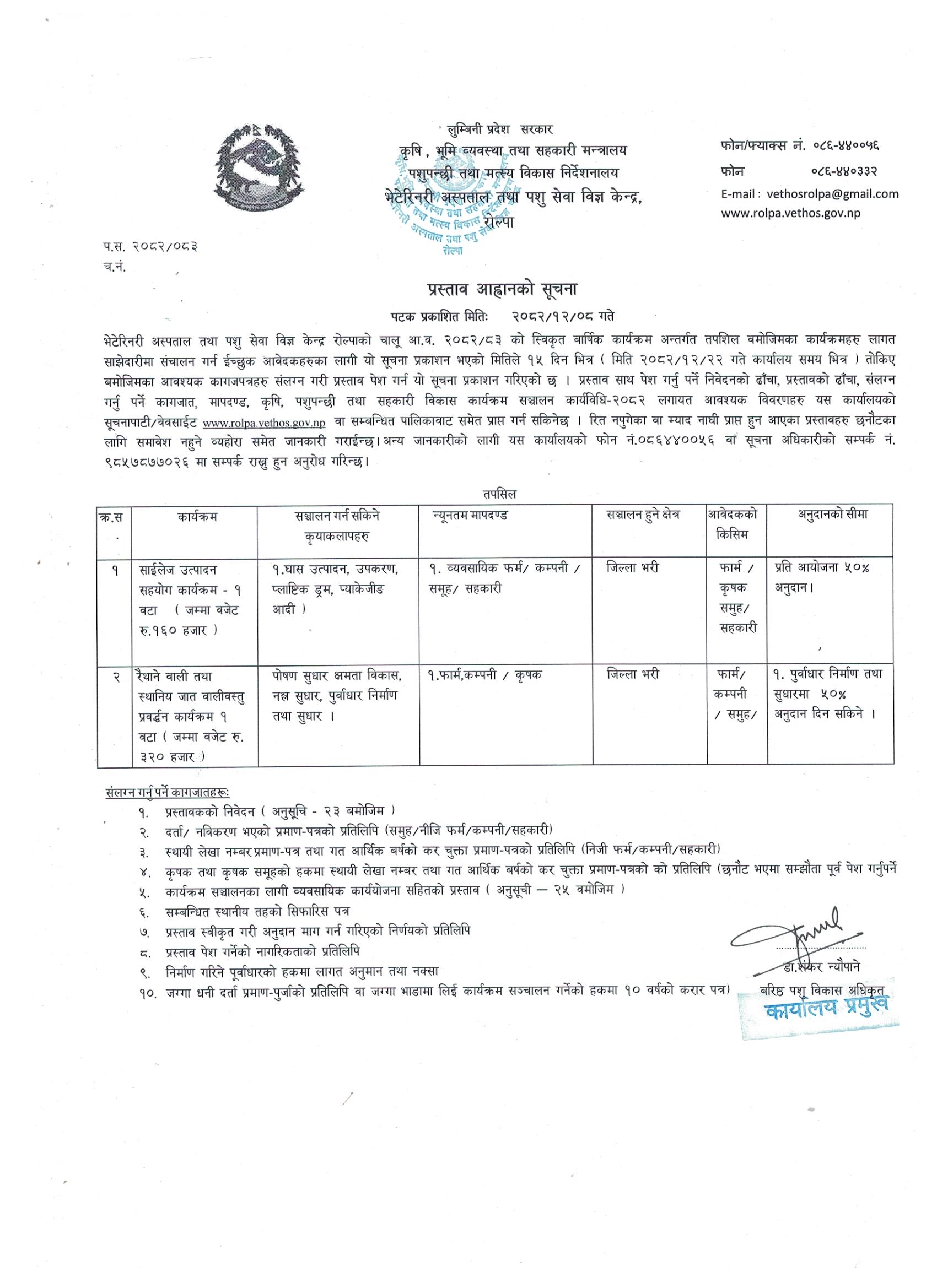 आर्थिक विकासको मेरुदण्ड कृषि नै भएकोले आधुनिक कृषि प्रविधिको प्रचार-प्रसार गरि परम्परागत कृषिमा आधारित प्रणालीमा सुधार ल्याई निर्वाहमूखी कृषि प्रणालीलाई व्यवसायिक कृषि प्रणालीमा रुपान्तरण गरी कृषकको जीवनस्तरमा सुधार ल्याउने तर्फ कार्यक्रम संचालन गर्नु यस कार्यालयको मुख्य जिम्मेवारी रहेको छ । यसै तथ्यलाई आत्मसात गरी जिल्लाकाे कृषि विकासले मूलुकको आर्थिक विकासमा पनि टेवा पु-याओस् भन्ने अभिप्रायले आ.व. २०३३/२०३४ सालमा जिल्ला पशु कार्यालयको स्थापनासँगै देशमा संघीयता कार्यान्वयन पश्चात ५ नम्वर प्रदेश सरकार अन्तरगत वि.स. २०७५ साल भाद्र २६ गते रोल्पा जिल्ला कार्य क्षेत्र कायम गरी भेटेरिनरी अस्पताल तथा पशु सेवा विज्ञ केन्द्र , रोल्पाको स्थापना भएको हो ।